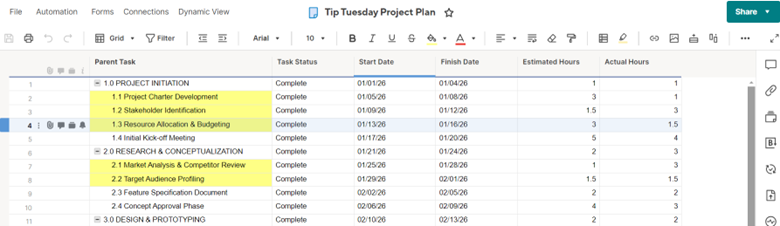 First, we will examine my two base sheets in Smart Sheet. I created a fake project, complete with tasks, due dates and parent tasks (these will be important when we connect the two sheets in Power BI). We can think of the Project Plan as the full scope of milestones we must complete to achieve our project’s goal while the Project Checklist is the detailed tasks necessary to complete those milestones.