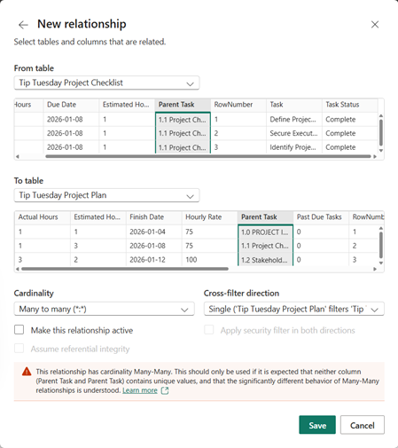 Since my parent column tasks align exactly in the two separate pages, I can make this a many to many relationship without risking any breaks. Once, I have my relationship configured, I can hit “Save.”