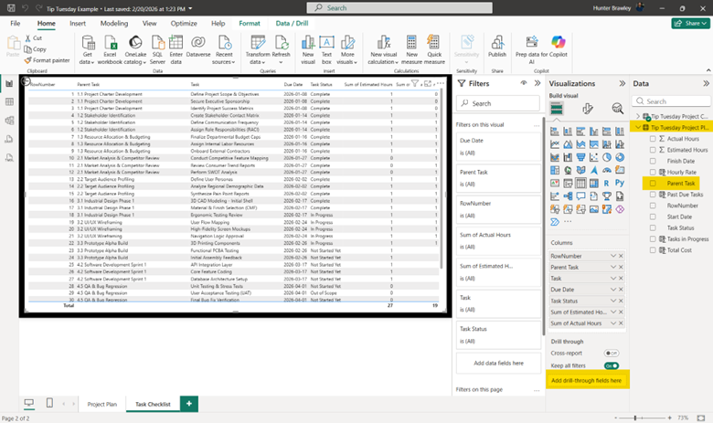 With that work complete, I can finish my drill-through. Since my Project Checklist contains the broken-down lists of tasks associated with the Project Plan, I will add my drill-through button on that screen. When adding a drill-through, remember to drag the value you which to drill on associated with the other table. In other words, I want to make sure I drag over the Parent Task column from the Project Plan, not the Project Checklist.
